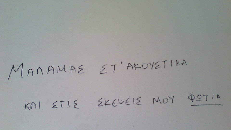 Γραμμένο σε τοίχο της Πάτρας και συγκεκριμένα στην οδό Κιλκίς. Αφιερωμένο στους θαυμαστές του Σωκράτη Μάλαμα!
