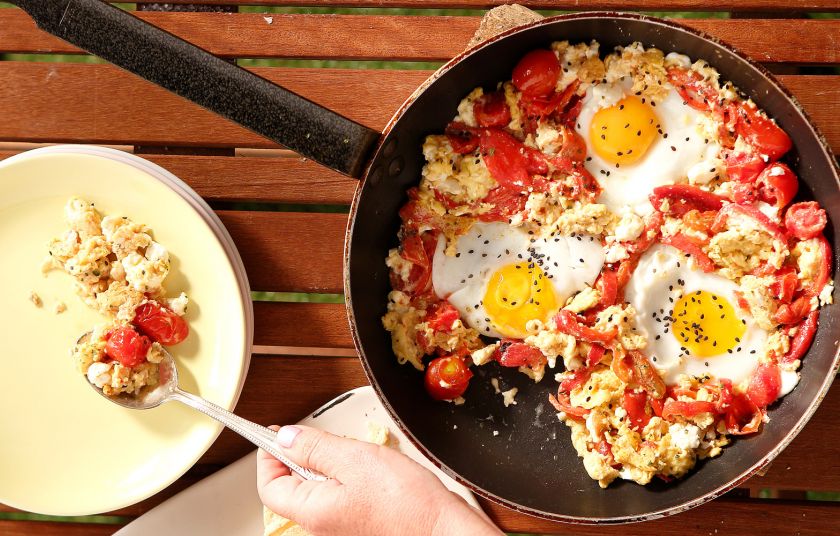 Τα μισά αυγά τα κάνουμε στραπατσάδα και τα υπόλοιπα τα κάνουμε μάτια στο ίδιο τηγάνι. Απολαύστε υπεύθυνα αυτό το θεσπέσιο φαγητό.