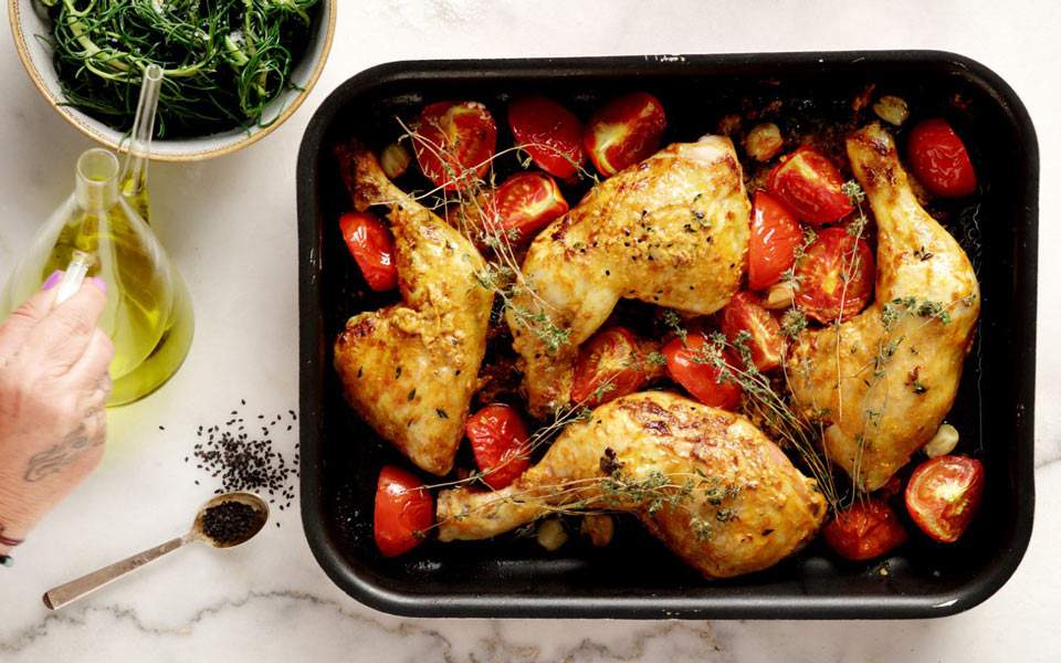 Σε ένα μπολ ανακατεύουμε όλα τα υλικά για το άλειμμα και τρίβουμε καλά το κοτόπουλο και κάτω από την πέτσα. Απλώνουμε σε ταψί που ιδανικά να τα χωράει ακριβώς και βάζουμε ανάμεσα τα σκόρδα.