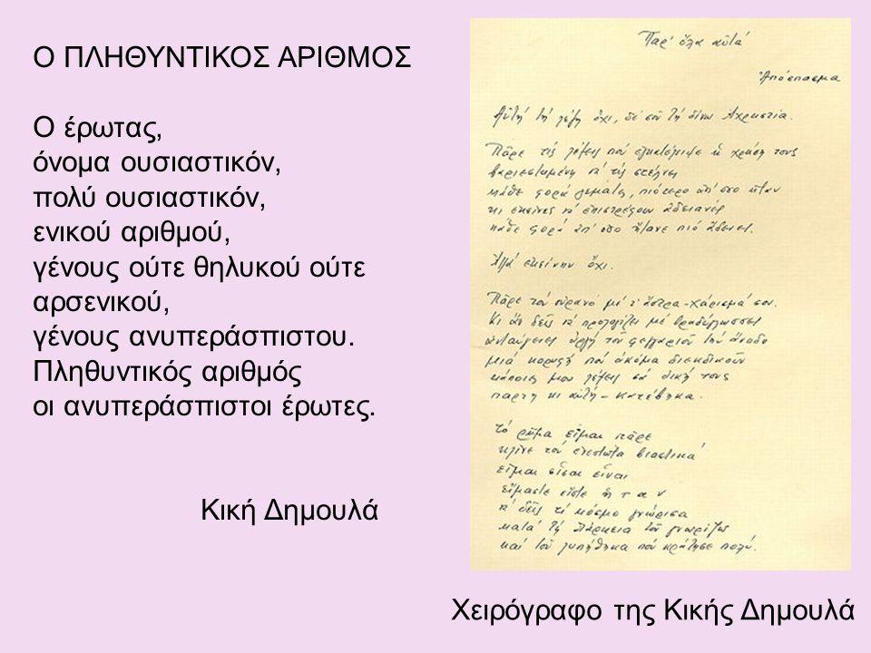 Η Κική Δημουλά, γεννημένη στις 6 Ιουνίου του 1931, είναι Ελληνίδα ποιήτρια και τακτικό μέλος της Ακαδημίας Αθηνών στην έδρα της ποίησης. Το πατρικό της όνομα είναι Βασιλική Ράδου.