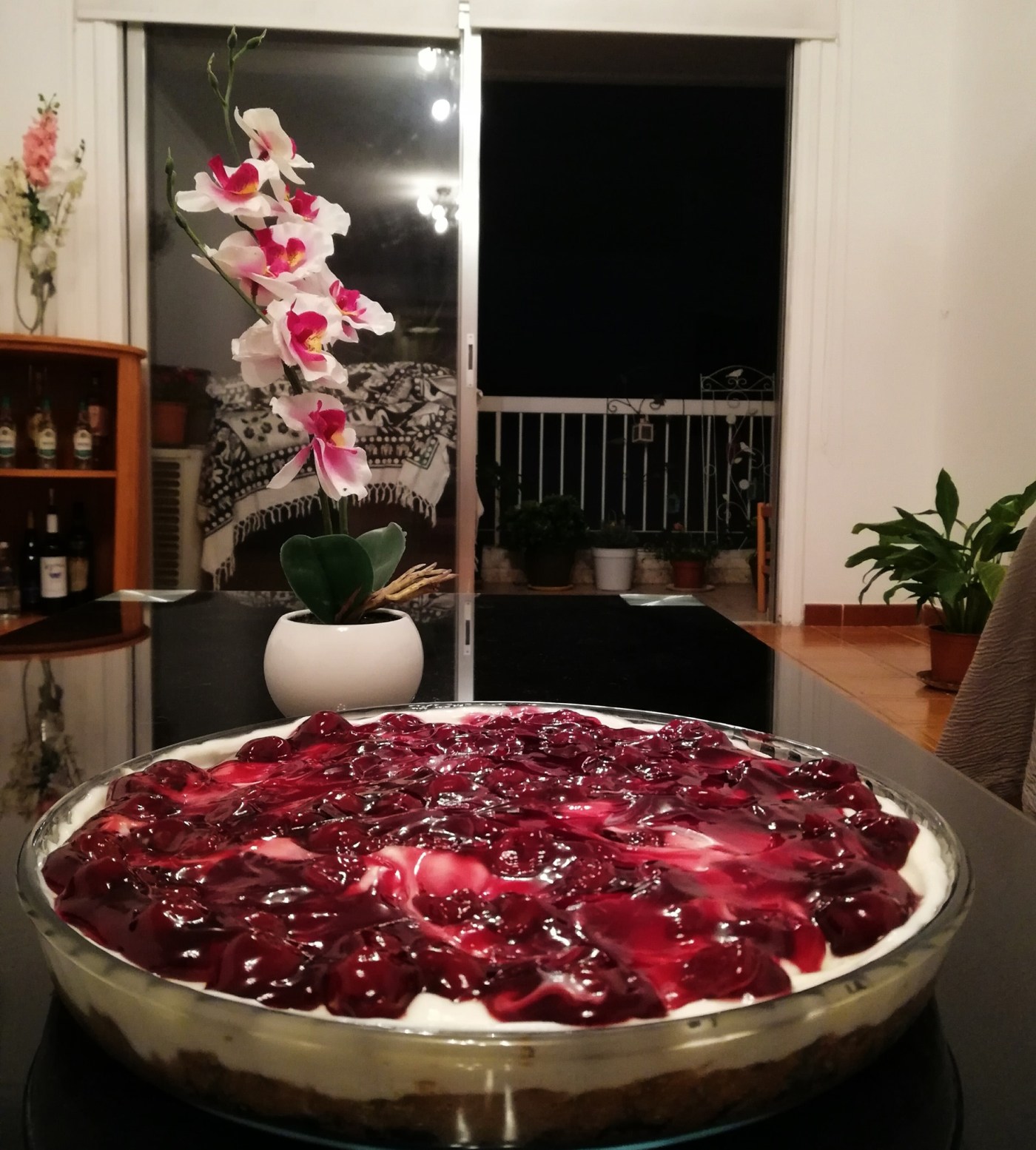 Μετά από μια ώρα ρίχνω την μαρμελάδα πάνω από την κρέμα και απλώνω με το κουτάλι.