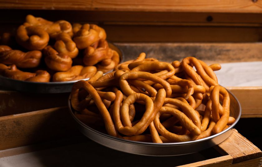 Συνεχίζουμε το ζύμωμα για αρκετά λεπτά, μέχρι η ζύμη να γίνει εύπλαστη και να ξεκολλά από τα χέρια ή τον κάδο. Τη σκεπάζουμε με πετσέτα και την αφήνουμε για 30 λεπτά σε ζεστό μέρος, να φουσκώσει. Μεταφέρουμε τη ζύμη σε ελαφρώς αλευρωμένη επιφάνεια και τη ζυμώνουμε λίγο για να ξεφουσκώσει. Κόβουμε κομμάτια βάρους περίπου 30 γρ., τα πλάθουμε σε κορδόνια με μήκος περίπου 15 εκ. και τους δίνουμε σχήμα μακρουλού, οβάλ σαλίγκαρου. Όσο πλάθουμε, για να μην κολλάει η ζύμη στα χέρια μας, τα αλείφουμε συχνά με ελαιόλαδο.