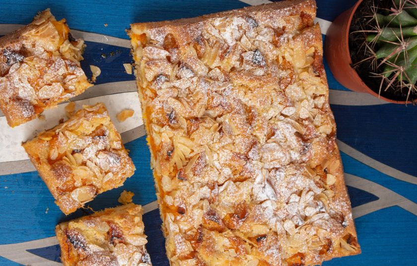 Προσθέτουμε με τη σειρά το αλεύρι, την αμυγδαλόσκονη και το ξύσμα, ανακατεύοντας συνεχώς μέχρι να γίνει ένα μείγμα ομοιογενές. Αδειάζουμε το μείγμα του κέικ σε ένα βουτυρωμένο και αλευρωμένο τετράγωνο ταψί διαστάσεων 24×24 εκ. Επάνω σε όλη την επιφάνεια στρώνουμε τα βερίκοκα, το ένα δίπλα στο άλλο, και πασπαλίζουμε με το αμύγδαλο φιλέ. Ψήνουμε σε προθερμασμένο φούρνο στους 170°C, για 40-50 λεπτά.