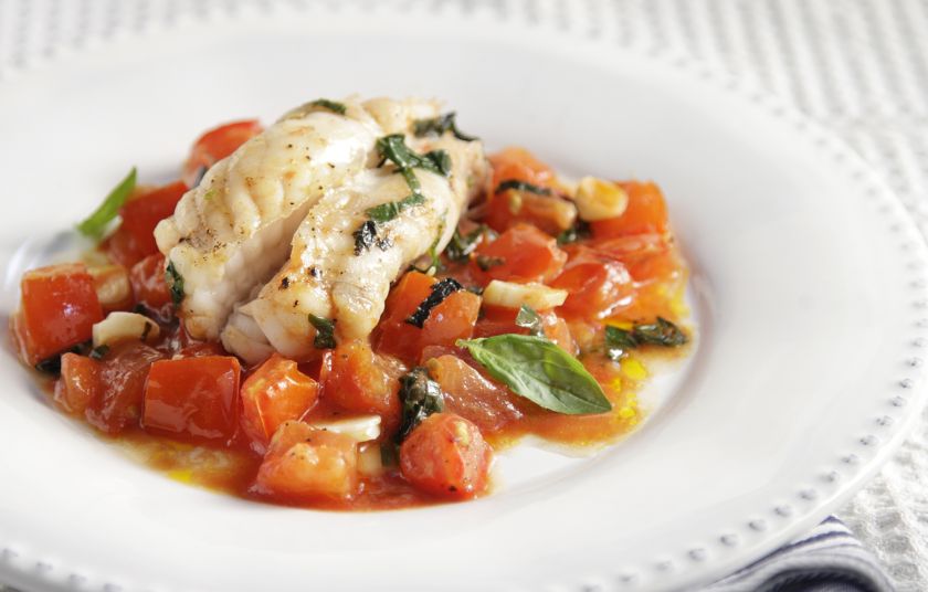 Προθερμαίνουμε το φούρνο στους 200° C. Σε ένα μεγάλο τηγάνι ζεσταίνουμε το ελαιόλαδο σε μέτρια φωτιά και σοτάρουμε το ψάρι, για περίπου 1 – 2 λεπτά από κάθε πλευρά, μέχρι να ροδίσει ελαφρώς και να σφίξει. Το βγάζουμε προσεκτικά με τρυπητή κουτάλα και το βάζουμε σε ένα μέτριο ταψί.