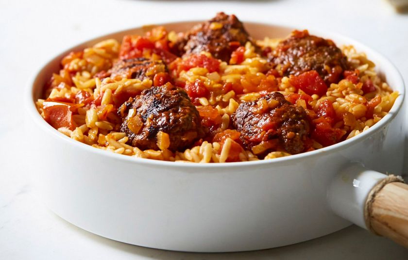 Γιουβέτσι: Προθερμαίνουμε τον φούρνο στους 170°C. Βράζουμε το κριθαράκι σε αλατισμένο νερό, σύμφωνα με τις οδηγίες της συσκευασίας του, και το στραγγίζουμε καλά. Σε ένα βαθύ πυρίμαχο ταψί βάζουμε το κριθαράκι και τη σάλτσα και ανακατεύουμε καλά. Τακτοποιούμε και τα κεφτεδάκια, μισομπήγοντάς τα στο κριθαράκι, και ψήνουμε για 10 λεπτά. Σερβίρουμε με φέτα ή γιαούρτι στραγγιστό.