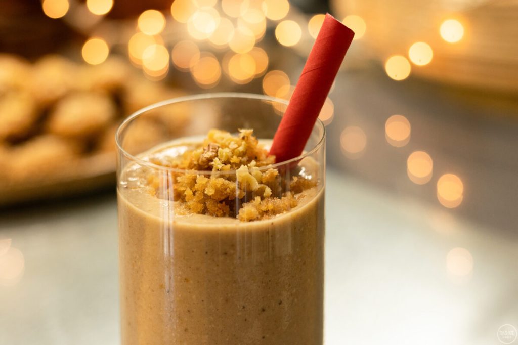 Μεταφέρουμε σε ένα μπλέντερ όλα τα υλικά και πολτοποιούμε καλά μέχρι να ομογενοποιηθούν. Σερβίρουμε με τριμμένη καρυδόψιχα.