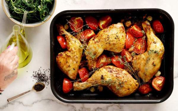 Κοτόπουλο στον φούρνο με ντομάτα, σκόρδο και θυμάρι